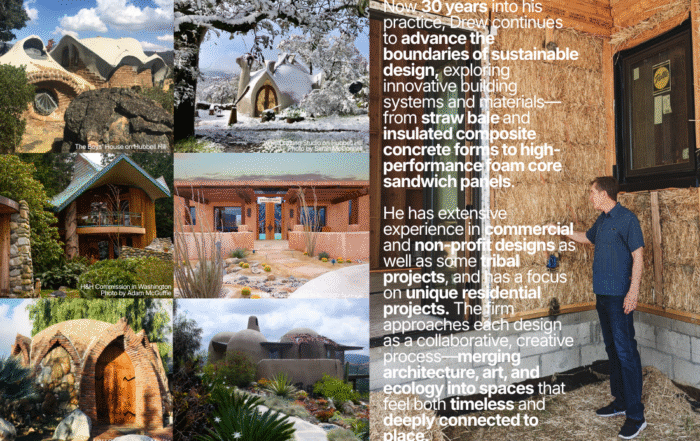Our first duty as architects is to create spaces that celebrate the excitement and mystery of our world in ways respectful of nature’s laws, as well as in ways that connect people to nature’s nourishing beauty. We accomplish these ideals by specializing in straw bale homes and other green building techniques such as green roofs, natural plasters, adobe, rainwater harvesting.
