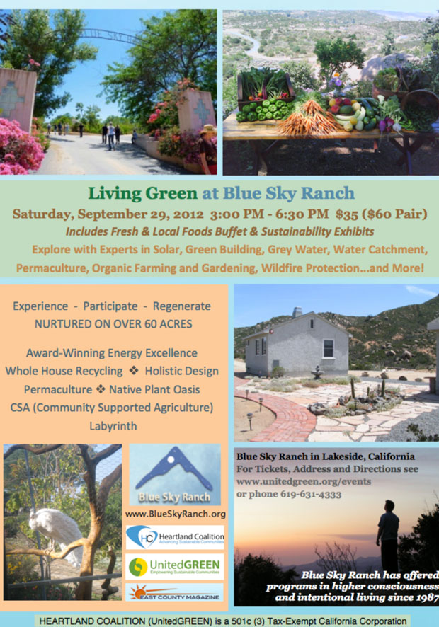 Since 2003, RegenerativeHomes has been providing the latest news and information on green living and sustainable building, eco-friendly materials and alternative energy, healthy environments and healing spaces. Now RegenerativeHomes is happy to announce Living Green at Blue Sky Ranch in Lakeside, California, launching on-going building, art, landscaping, organic gardening and all-natural agricultural projects on 60-acres allowing YOU and/or YOUR BUSINESS to collaborate, educate, promote and learn. This is a non-profit fund-raising event for Heartland Coalition/UnitedGREEN and the Blue Sky Community. Participate now!