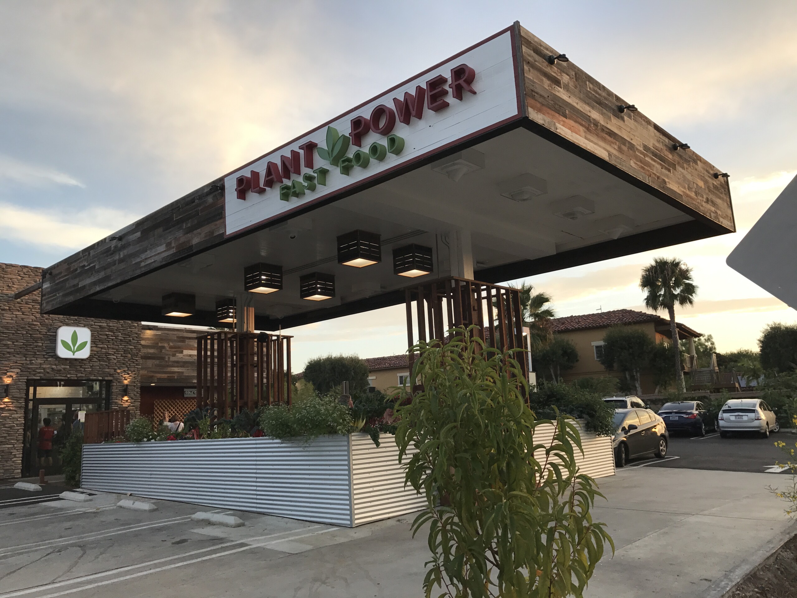 The new home of Plant Power Fast Food’s second establishment was previously a vacant gas station for many years, an eye-sore in the beautiful sea-side community of Encinitas. From the beginning, the client and architect wanted to transform the existing structures in a way that saved waste material while completely transforming the look and feel of the property. The existing 1,348 sf building is entirely taken up by the kitchen, so ordering is done through a small lobby and outdoor ordering kiosks, as well as a traditional drive-thru disguised behind bamboo. The dining area is outdoors on a new deck completely surrounding with organic veggie planters and vine trellises, all under the existing gas station canopy. The facades had to be updated for the new eco-friendly client with sustainable products, so salvaged redwood from barn structures were used to wrap the existing building front and canopy structure.