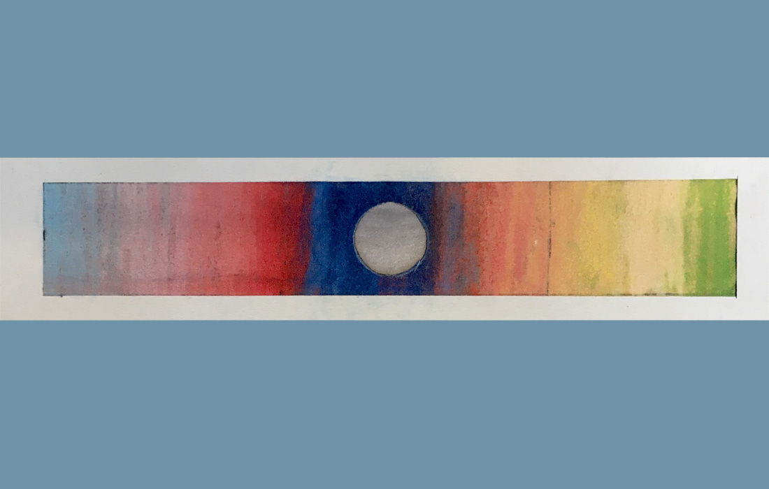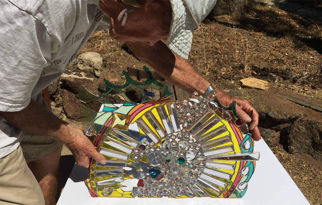 Hubbell and Hubbell Architects and James Hubbell Studio paired up for a commission of stained glass and an oil painting at SDGE to spice up their hallway leading to the lunch room. The stained glass piece, consisting of former chandelier pieces and beveled glass as well as glass from Germany, creates prisms on the opposite wall where an oil painting of a silver-leaf moon is mounted. James designed the two to play off of each other when the light shines through around lunch time.