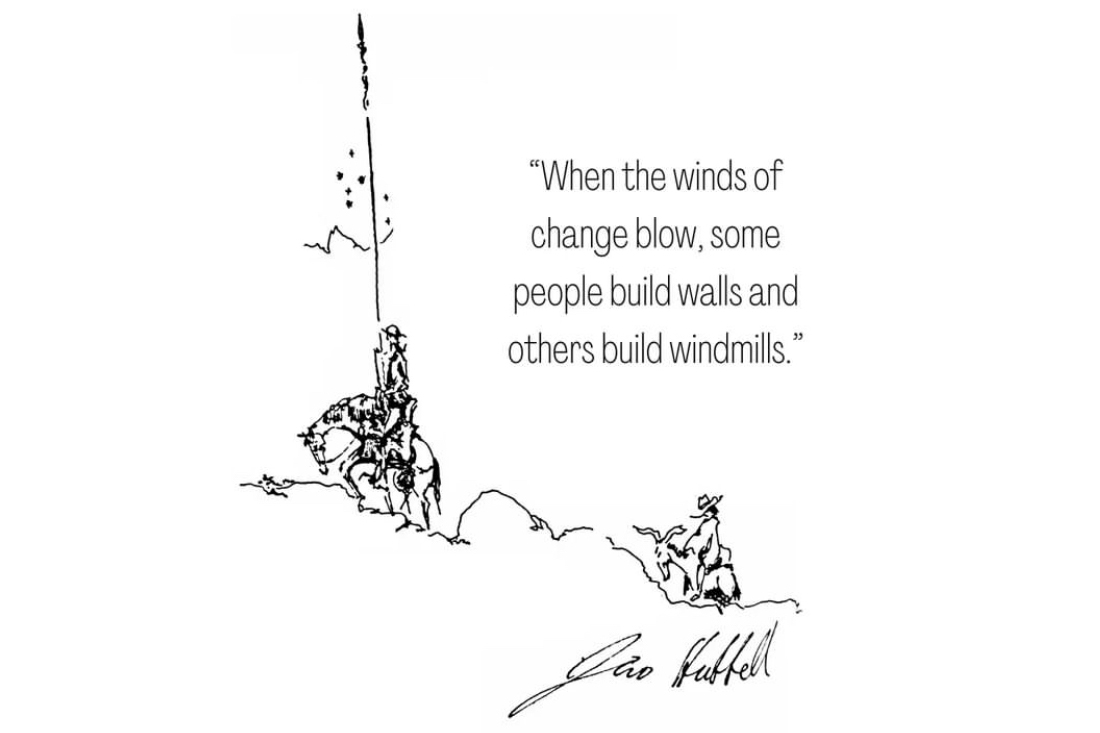 Happy New Year from Hubbell and Hubbell Architects. This Chinese proverb serves as good inspiration from the start of a new year – and it pairs well with a James Hubbell sketch based on the story of Don Quixote by Miguel de Cervantes. Have you read it? If not, give the satire a read for a humorous but inspiring story about hope and chivalry.