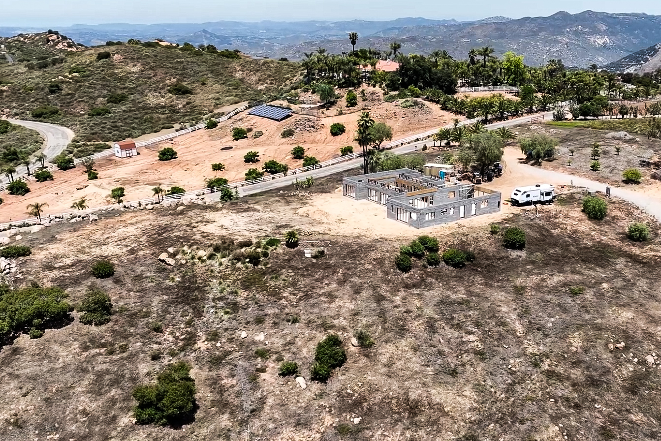 This 3,000 SF Mediterranean-inspired home is currently under construction on one of the gentle higher elevation slopes in Ramona, California. The owners came to us with their goal of building a sustainable and resilient home. They were especially interested in ensuring that the home was highly fire resistant because the previous house on the property was destroyed during the 2007 Witch Creek Fire. Together with the homeowners, we decided that ICCF (insulated composite concrete form) would be the right material choice. The ICCF building blocks are manufactured in Arizona and provide a super-insulated wall system that is resistant to fire, mold, and termites. The house layout includes a large open great room including the kitchen, dining, and living area that connects to two separate bedroom wings. The two wings remain private from one another as well as private from the great room. The great room features tall, vaulted ceilings and spills out onto a covered patio. The patio overlooks the beautiful vistas of the property and serves as an extension of the interior living space. The owners hope to eventually turn this wonderful property into a functioning vineyard.