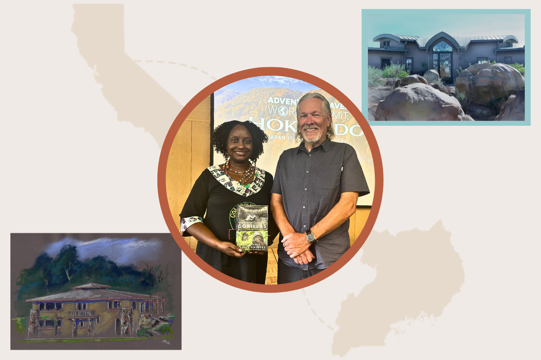 We got a blast from the past – well actually two blasts – when one of our past clients, Steve, reached out to share a special story with us. We designed a net-zero, ICCF house for Steve near the Elfin Forest in Escondido, California. Recently, Steve was on a visit to Uganda and met Dr. Gladys Kalema Zikusoka, the founder of Conservation Through Public Health (CTPH). Drew Hubbell and his father, James Hubbell, worked with Dr. Gladys and CTPH to create a home for gorilla research in Bwindi, Uganda. During Dr. Gladys and Steve’s meeting, she mentioned to Steve that her and her husband plan to someday build a home in Bwindi and that they want to have Drew Hubbell as their architect. It was at this moment that Steve and Dr. Gladys experienced the classic “Small World” feeling!