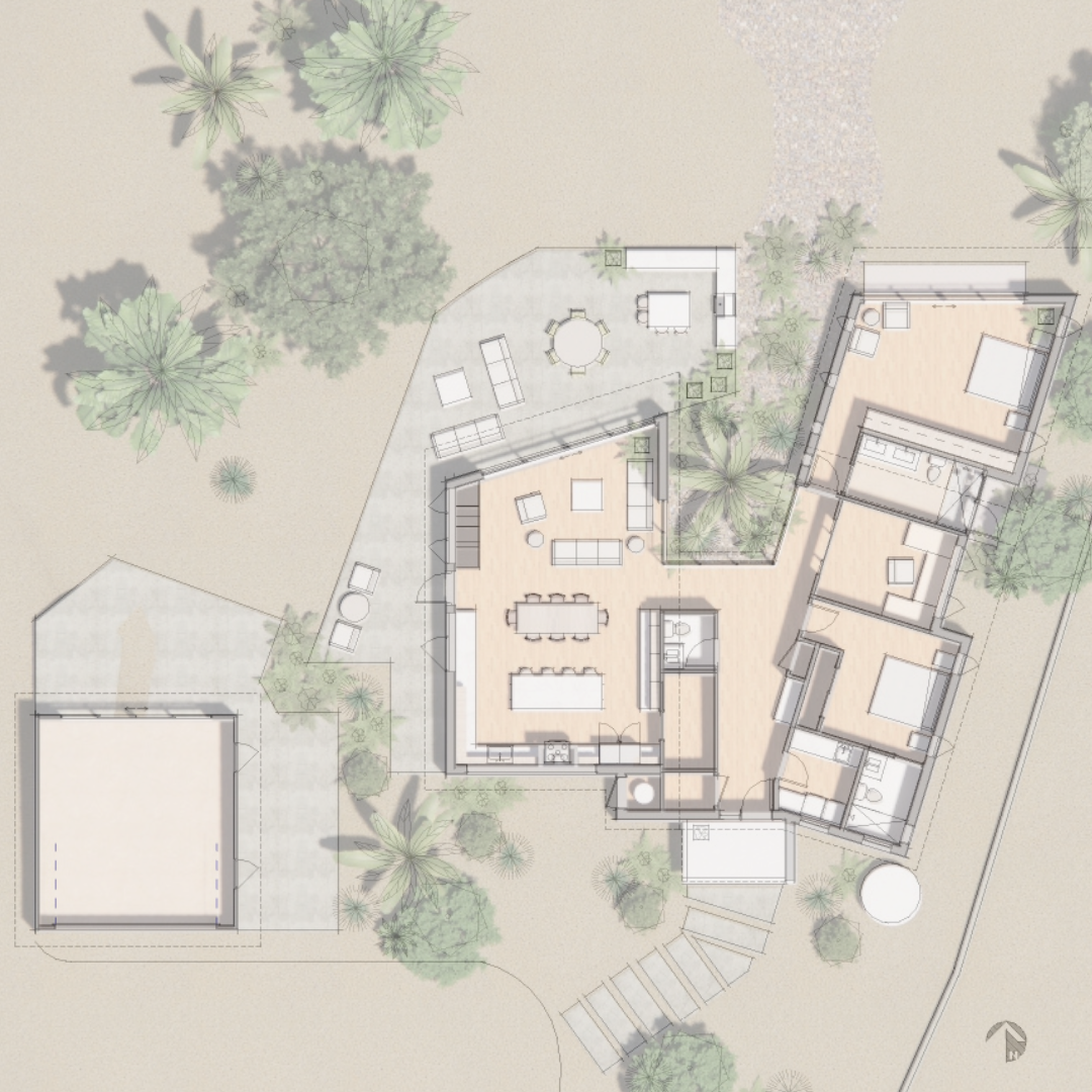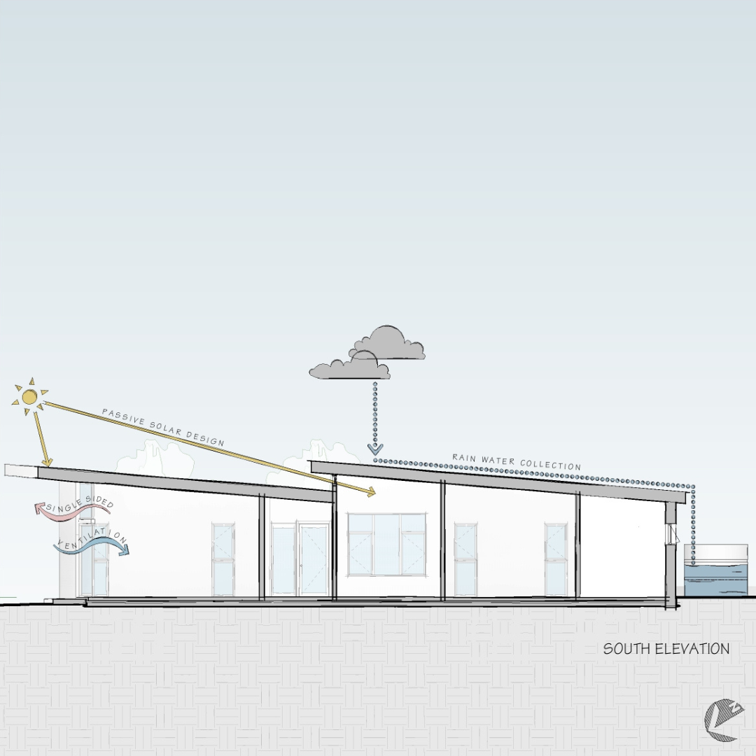 The sloped roof creates a perfect opportunity for rainwater harvesting, while pervious pathways allow rainwater to naturally return to the earth. Carefully considered native and drought tolerant landscaping further reduces the design’s impact on the environment. The landscape also serves as creating harmony between the home and its natural surrounding environment.