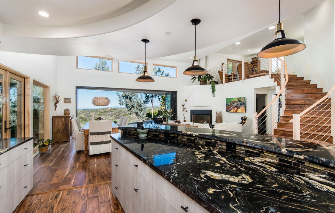 Located in Leucadia, this beautiful home is snuggled into the hillside overlooking a canyon that frames views straight to the Pacific Ocean.