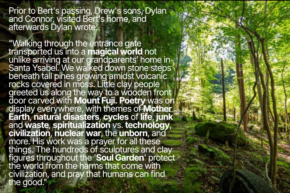 “Walking through the entrance gate transported us into a magical world not unlike arriving at our grandparents’ home in Santa Ysabel. We walked down stone steps beneath tall pines growing amidst volcanic rocks covered in moss. Little clay people greeted us along the way to a wooden front door carved with Mount Fuji. Poetry was on display everywhere, with themes of Mother Earth, natural disasters, cycles of life, junk and waste, spiritualization vs. technology, civilization, nuclear war, the unborn, and more. His work was a prayer for all these things. The hundreds of sculptures and clay figures throughout the ‘Soul Garden’ protect the world from the harms that come with civilization, and pray that humans can find the good.”