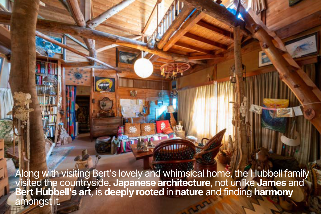 Along with visiting Bert’s lovely and whimsical home, the Hubbell family visited the countryside. Japanese architecture, not unlike James and Bert Hubbell’s art, is deeply rooted in nature and finding harmony amongst it. Natural materials, especially wood, clay, bamboo, and paper screens, are utilized consistently.