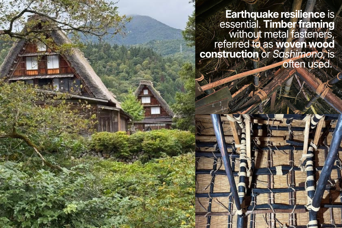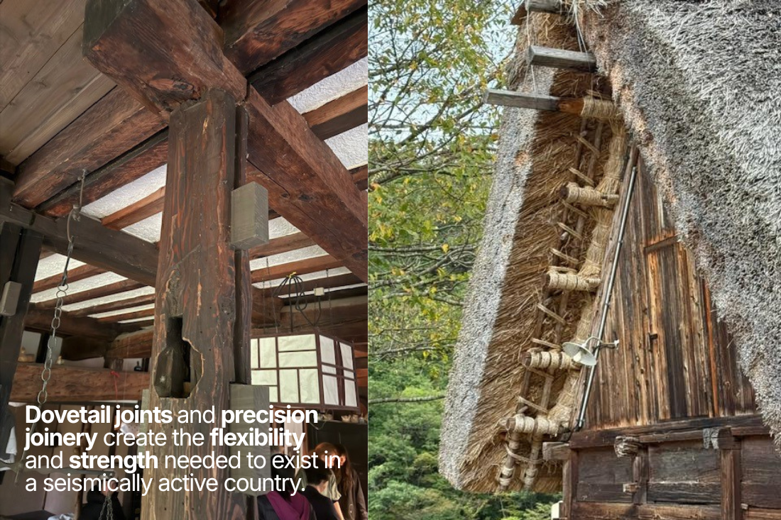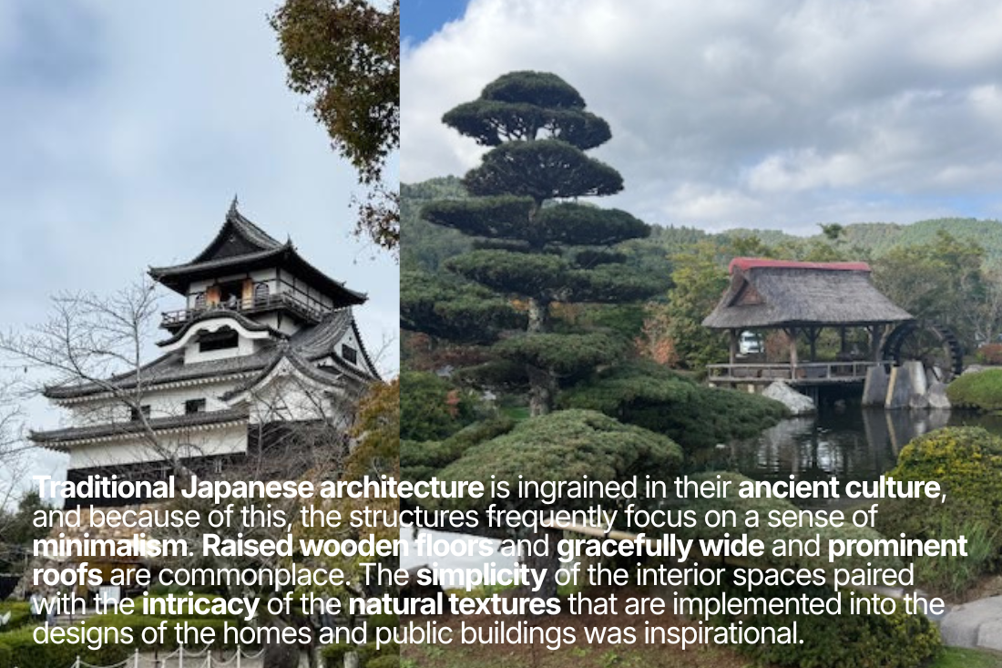 Traditional Japanese architecture is ingrained in their ancient culture, and because of this, the structures frequently focus on a sense of minimalism. Raised wooden floors and gracefully wide and prominent roofs are commonplace. The simplicity of the interior spaces paired with the intricacy of the natural textures that were implemented into the designs of the homes and public buildings was inspirational. Earthquake resilience is essential, so timber framing without metal fasteners, referred to as woven wood construction or Sashimono, is often used. Dovetail joints and precision joinery create the flexibility and strength needed to exist in a seismically active country. Handcrafted art and an awareness of beauty are important elements of Japanese culture & are woven into their architecture.