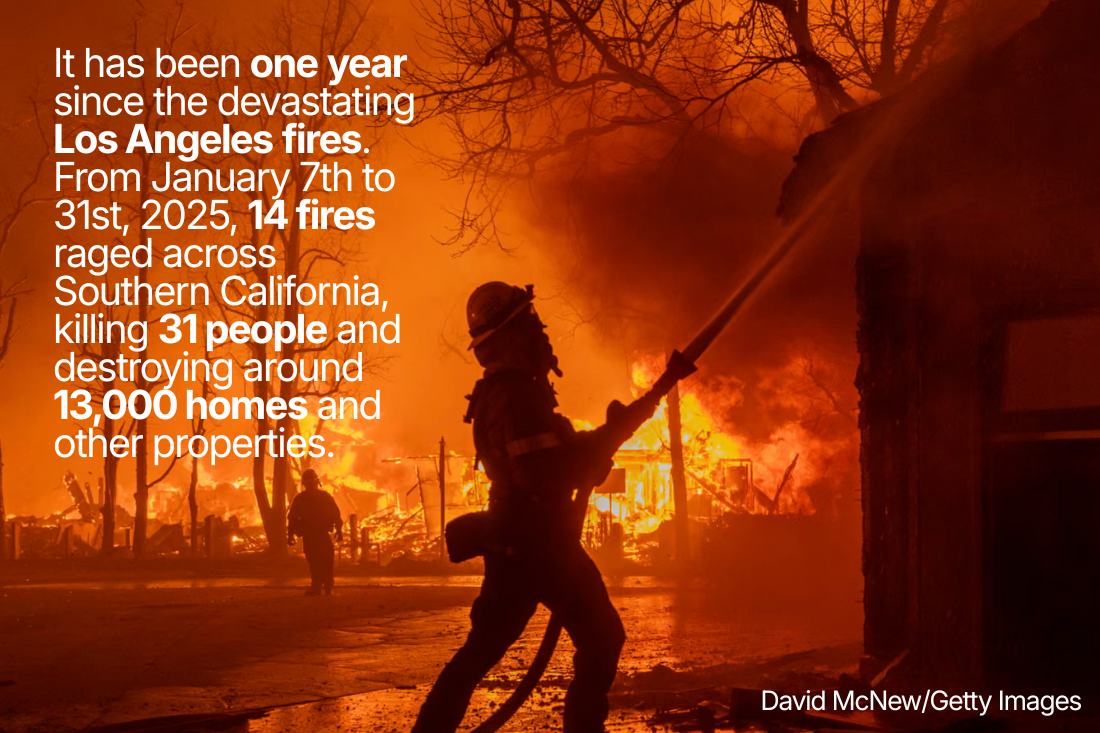 It has been one year since the devastating LA fires. From January 7th to 31st, 2025, 14 fires raged across Southern California, killing 31 people and destroying around 13,000 homes and other properties.