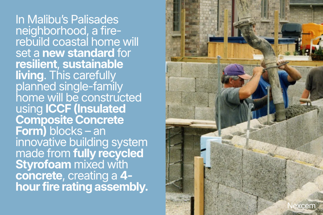 In Malibu’s Palisades neighborhood, a fire-rebuild coastal home will set a new standard for resilient, sustainable living. This carefully planned single-family home will be constructed using ICCF (Insulated Composite Concrete Form) blocks – an innovative building system made from fully recycled Styrofoam mixed with concrete, creating a 4-hour fire rating assembly.