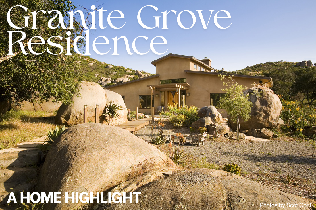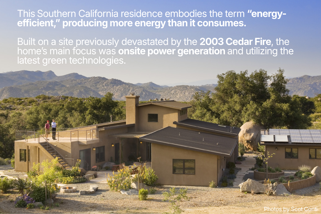 This Southern California residence embodies the term “energy-efficient,” producing more energy than it consumes. Built on a site previously devastated by the 2003 Cedar Fire, the home’s main focus was onsite power generation and utilizing the latest green technologies.