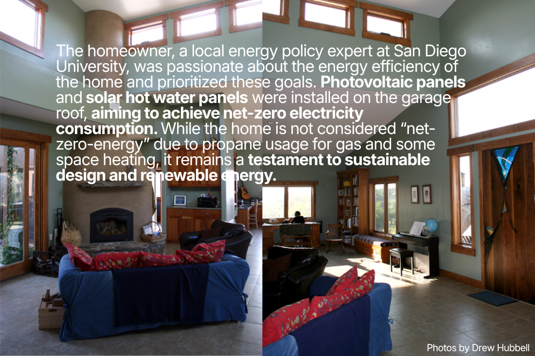 The homeowner, a local energy policy expert at San Diego University, was passionate about the energy efficiency of the home and prioritized these goals. Photovoltaic panels and solar hot water panels were installed on the garage roof, aiming to achieve net-zero electricity consumption. While the home is not considered “net-zero-energy” due to propane usage for gas and some space heating, it remains a testament to sustainable design and renewable energy.