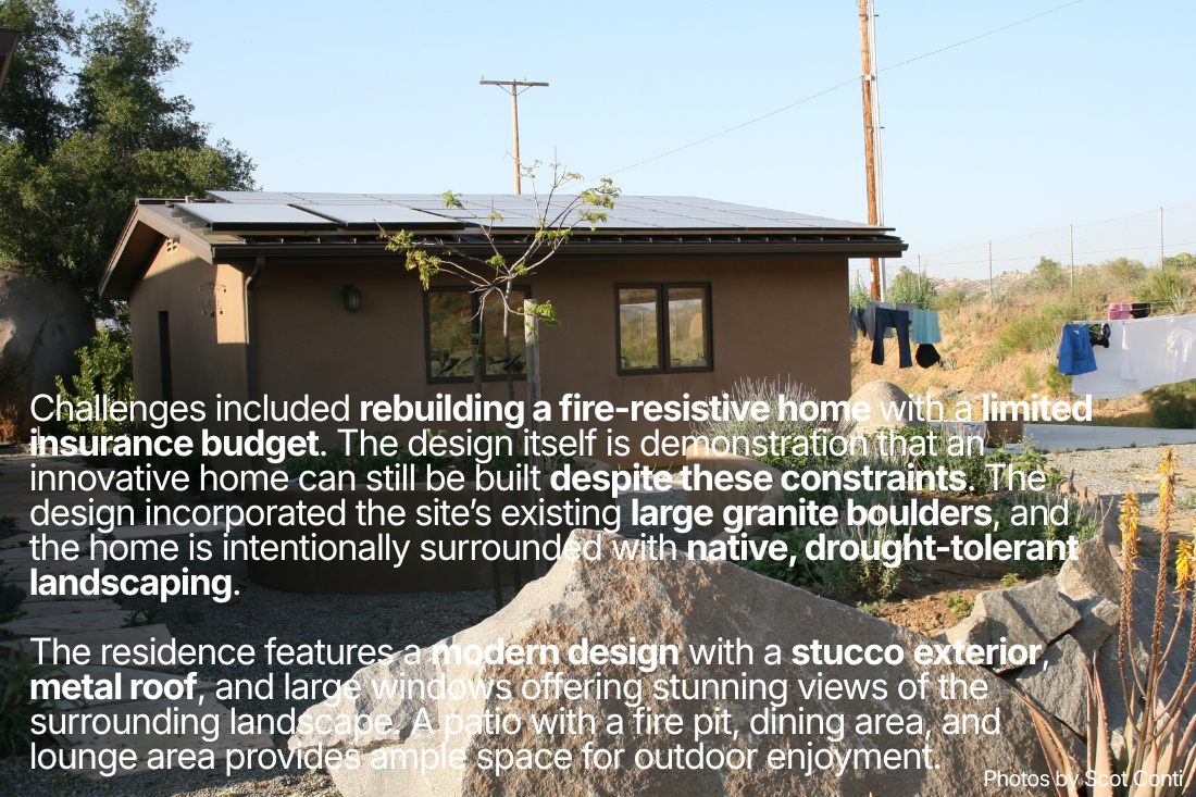 Challenges included rebuilding a fire-resistive home with a limited insurance budget. The design itself is demonstration that an innovative home can still be built despite these constraints. The design incorporated the site’s existing large granite boulders, and the home is intentionally surrounded with native, drought-tolerant landscaping.