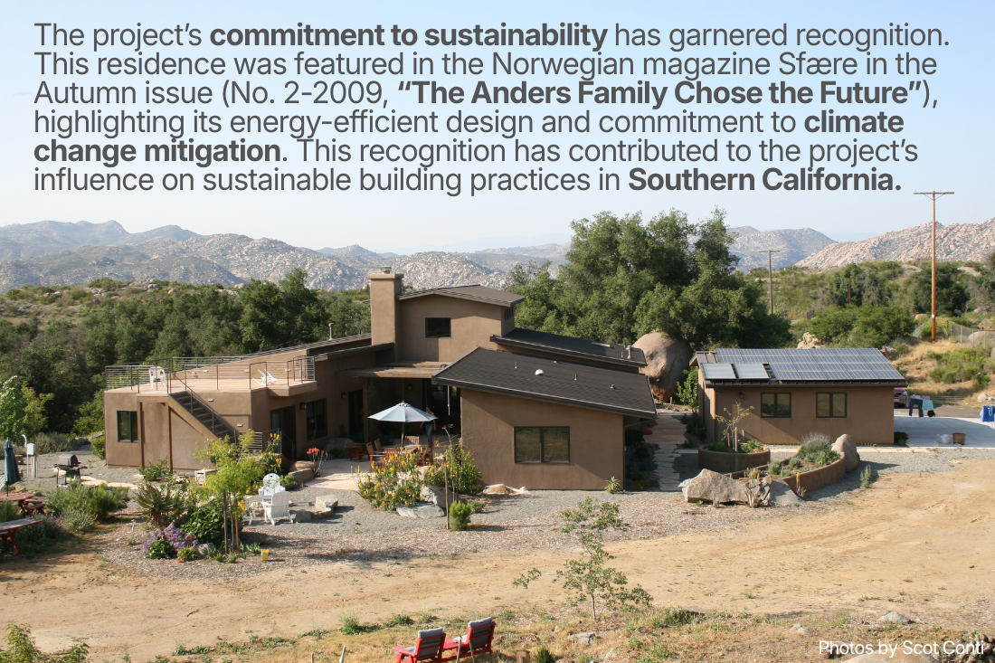The project’s commitment to sustainability has garnered recognition. The Anders Residence was featured in the Norwegian magazine Sfære in the Autumn issue (No. 2-2009, “The Anders Family Chose the Future”), highlighting its energy-efficient design and commitment to climate change mitigation. This recognition has contributed to the project’s influence on sustainable building practices in Southern California.
