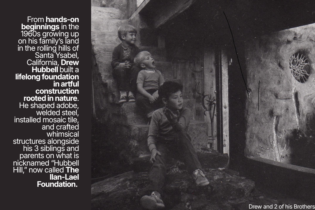 From hands-on beginnings in the 1960s growing up on his family’s land in the rolling hills of Santa Ysabel, California, Drew Hubbell built a lifelong foundation in artful construction rooted in nature. He shaped adobe, welded steel, installed mosaic tile, and crafted whimsical structures alongside his 3 siblings and parents on what is nicknamed “Hubbell Hill,” now called The Ilan-Lael Foundation.