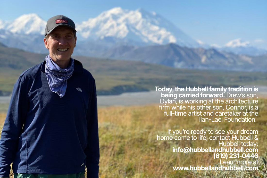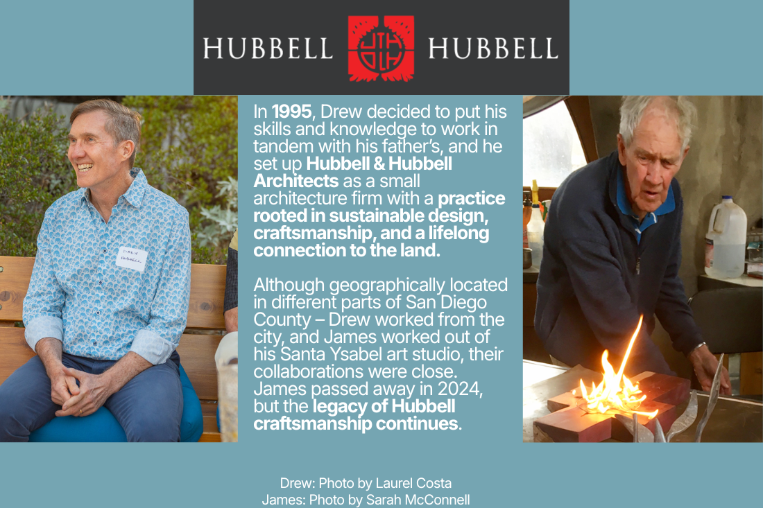 In 1995, Drew decided to put his skills and knowledge to work in tandem with his father’s, and he set up Hubbell & Hubbell Architects as a small architecture firm with a practice rooted in sustainable design, craftsmanship, and a lifelong connection to the land. Although geographically located in different parts of San Diego County – Drew worked from San Diego and James worked out of his Santa Ysabel art studio, their collaborations were close. James passed away in 2024, but the legacy of Hubbell craftsmanship continues.