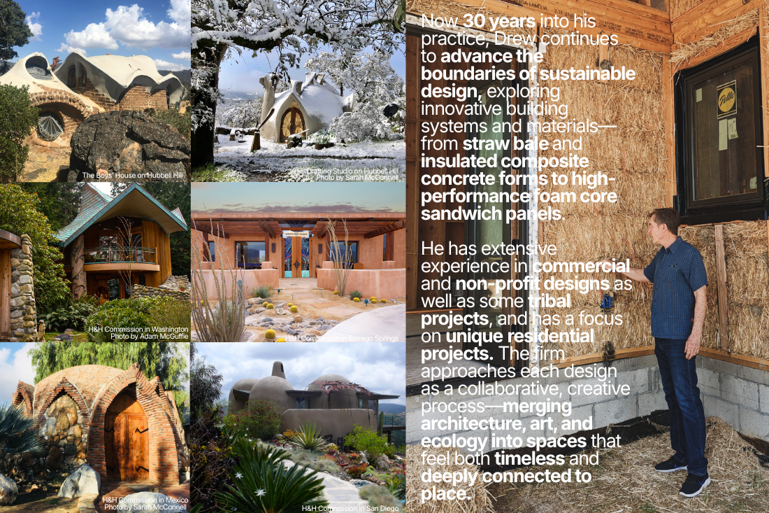 Now 30 years into his practice, Drew continues to advance the boundaries of sustainable design, exploring innovative building systems and materials—from straw bale and insulated composite concrete forms to high-performance foam core sandwich panels. He has extensive experience in commercial and non-profit designs as well as some tribal projects, and has a focus on unique residential projects. The firm approaches each design as a collaborative, creative process—merging architecture, art, and ecology into spaces that feel both timeless and deeply connected to place.