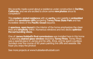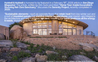 Hubbell & Hubbell is honored to be featured in a February 19th, 2026 article in San Diego Magazine! The article, written by Dirk Sutro and titled “Home Tour: Inside Escondido’s Stunning Net-Zero Sanctuary,” discusses the Serenity Project, recently completed in 2025. “Sustainable elements—such as concrete floors that retain heat from low winter sun and a [...more]
