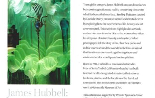 My father, James Hubbell, is having a show at Oceanside Museum of Art, and the opening is tomorrow, Saturday, September 22nd from 5-8PM. The show, called Seeking Balance, features some older works from the 50s and 60s as well as photographs, sculptures, paintings, and more. Check out the flyer for more information. See you there!