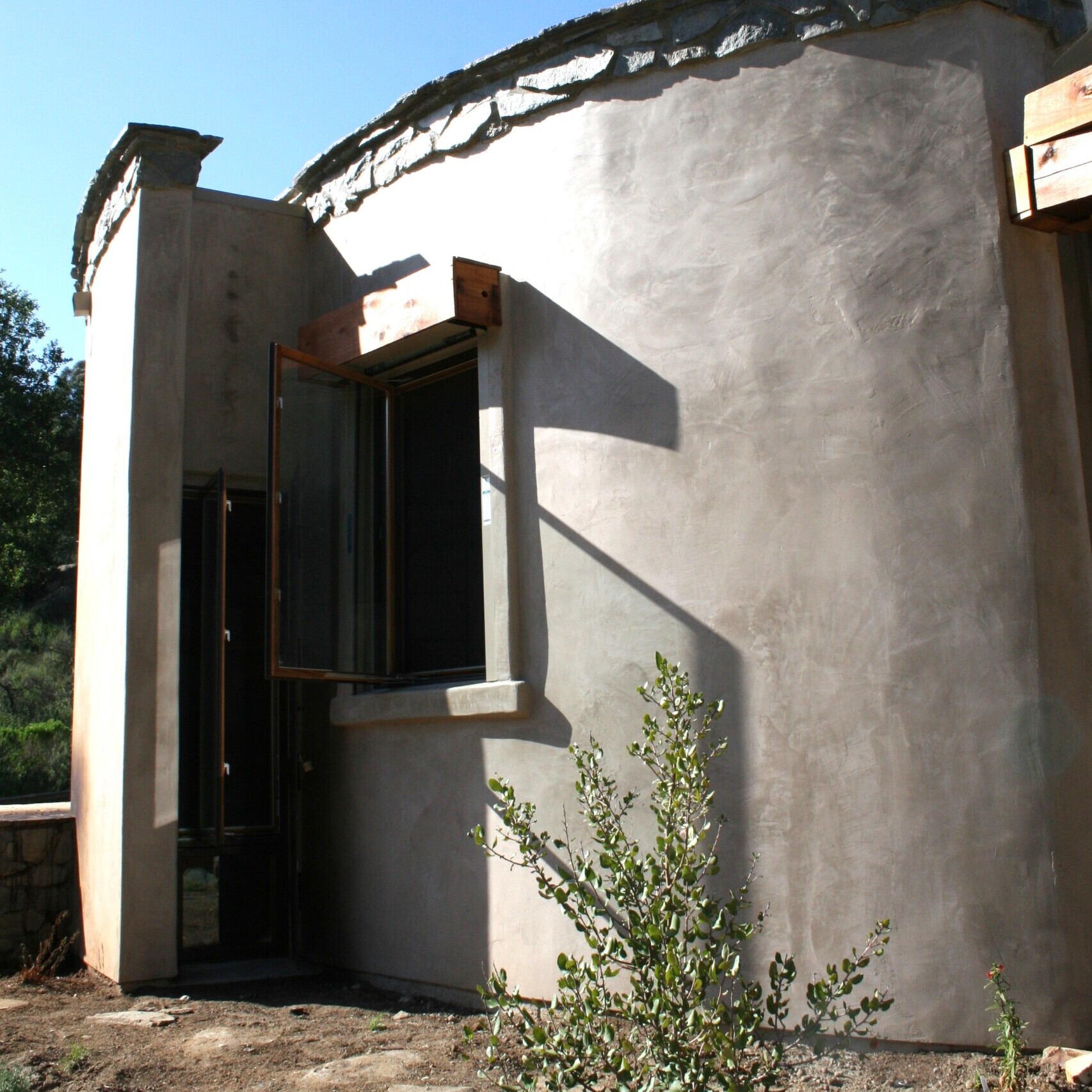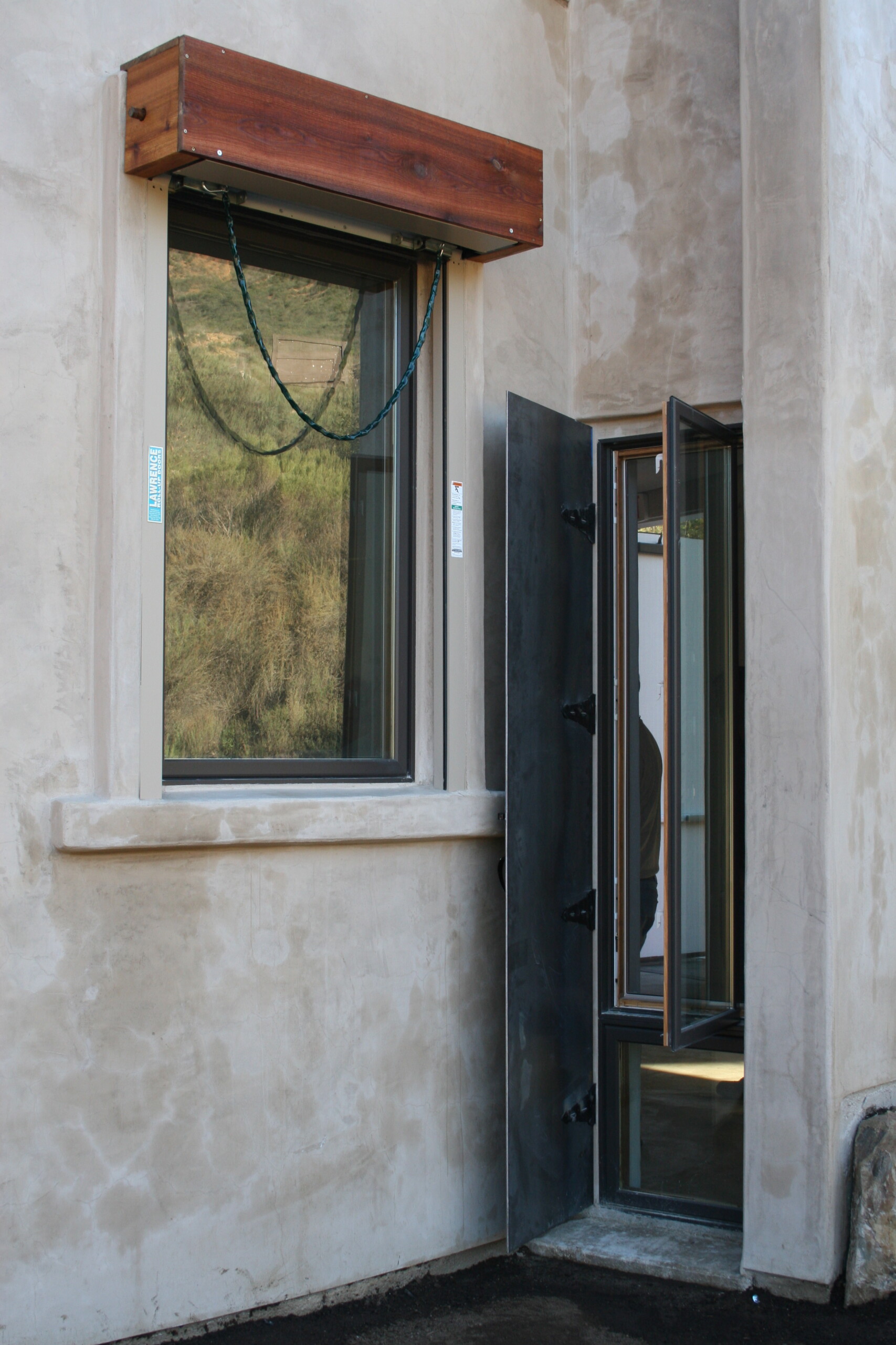 Photo 3: A closer look at the windows. The shutter track on either side of the window blends seamlessly with the natural plaster finish. The smaller, secondary window doesn’t have an overhead fire shutter, but rather a steel plate on hinges that can be manually closed to protect the building.