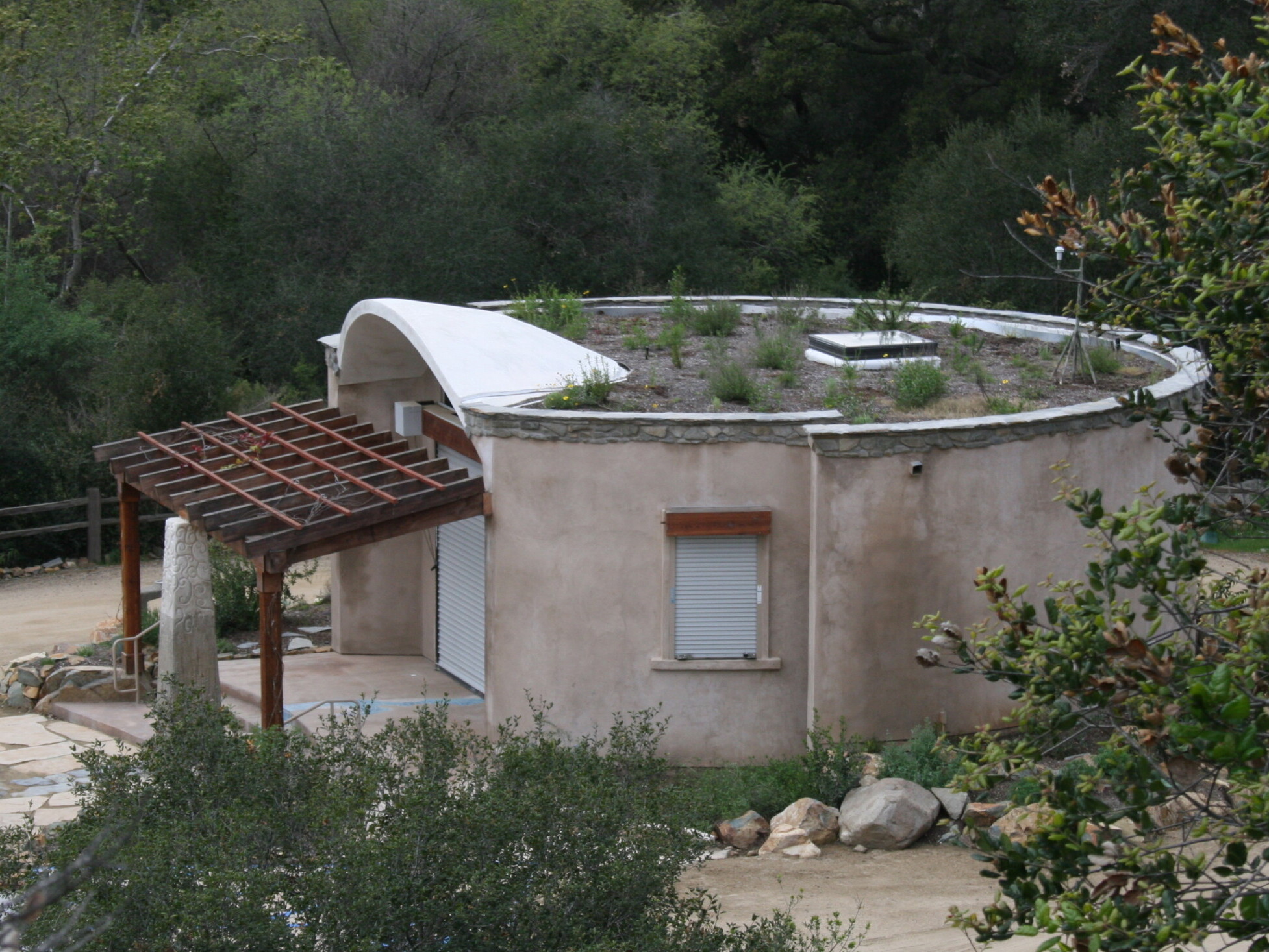 The photos to the right are of the Elfin Forest Interpretive Center, a welcome and learning center in Escondido, CA. The design of the building integrates fire shutters as a strategy to protect again fires. Below is a description of each photo.