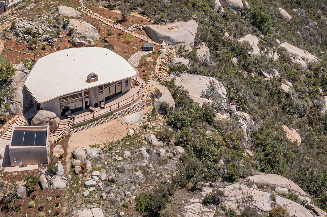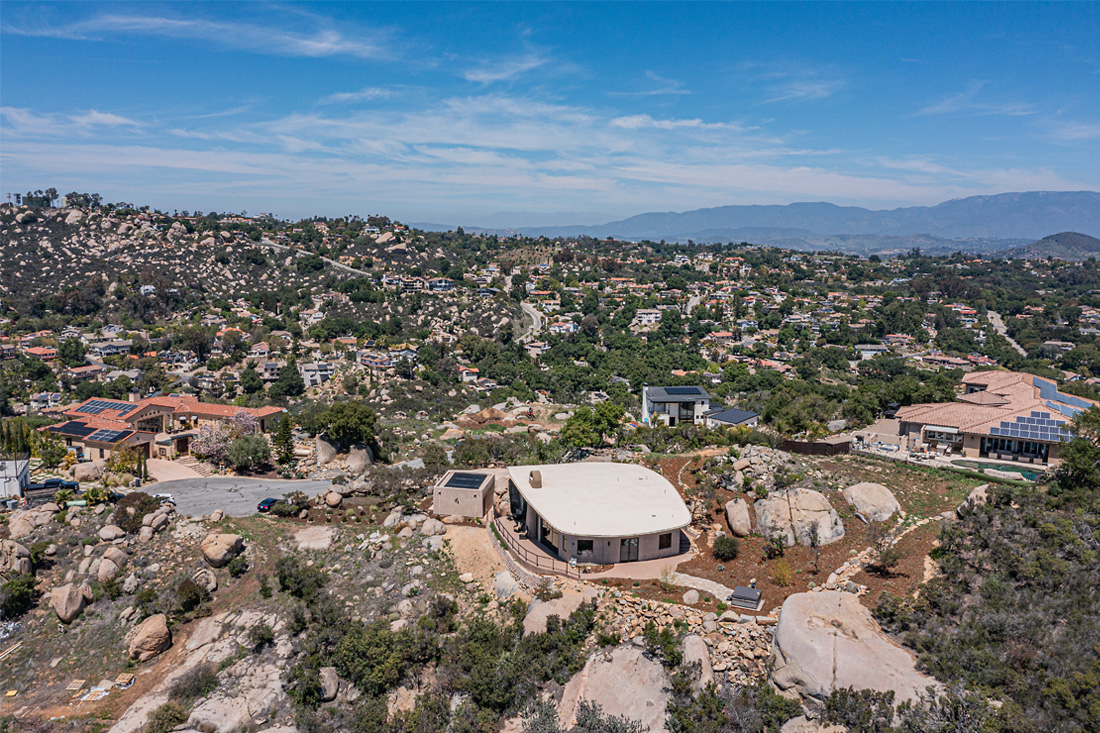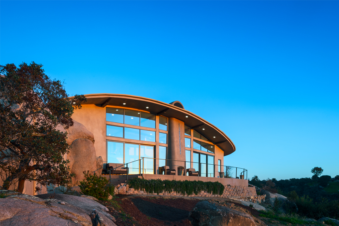 The Serenity Project: Under the Oaks, is nestled on a site with manzanita trees, California oak trees, and majestic boulders in the northern region of Escondido, California. This sustainable single-family residence overlooks a canyon with spectacular views of the Pacific Ocean and views to the east of Palomar Mountain. The land was undeveloped and the owner purchased the site with the dream of creating a “model resilient, green home” that would honor the natural contours of the environment and give homage to the indigenous cultures of the region. She wanted the design to inspire others to build green while creating a memorable experience for visitors to immerse themselves into a unique and beautiful home surrounded by equally beautiful Southern California nature. The owner’s design consultant aptly describes the project as, “The Museum of Our Imagination.”