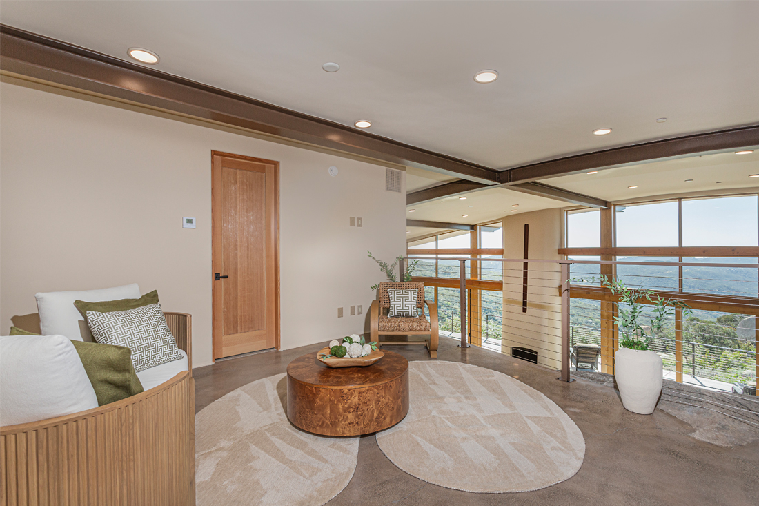 The beautiful, custom front door, built by artist Dan Thoner, invites you into the home where you enter a few steps above the main level of the home. To the left is another large boulder that we kept as part of the design to further immerse the home into the surrounding site. Curved concrete steps wrap around the edge of the boulder and lead to the loft. Straight ahead is the view of the living room, dining room, and kitchen. In the kitchen is a large window that allows you to see all the way through the house and to the native landscape outside. To the right are large sliding glass doors and windows that frame the expansive view to the canyon and beyond to the Pacific Ocean. Above the doors is a light shelf that creates shade and helps sunlight bounce into the home without creating direct light. The operable windows above the light shelf are controlled by a switch to take advantage of cross ventilation.